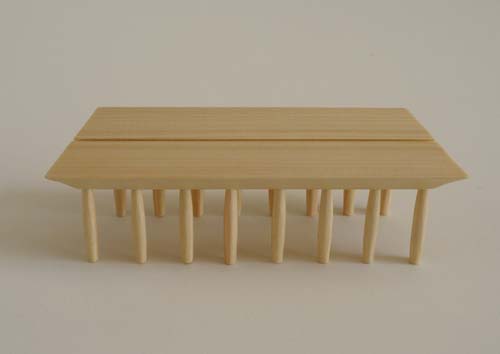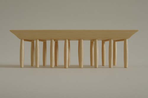 code:NARA 奈良をデザインコードとした長椅子です。1400年以上前から受け継がれて来た奈良の精神的背景をエンタシスの列柱・そりあがった座面(屋根)・座面をつなぐ梁 をもちいて表現しました。